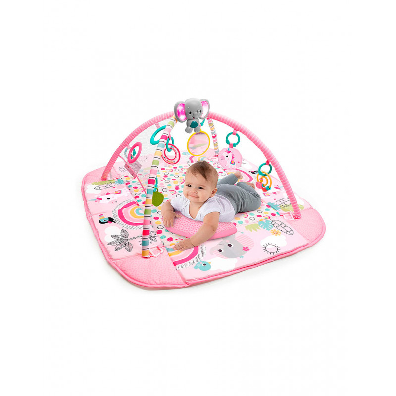 Durante sus primeros meses, pon la manta extendida en el suelo para poder tumbar en ella a tu bebé. Incluye un almohadón especial para ello. El animado elefante emite música y luces para captar la atención del bebé. Diversión sin fin con sus otros 6 juguetes: colgante, juguete rugoso, espejo para bebés, tarjetas, hojas colgantes y sonajero.