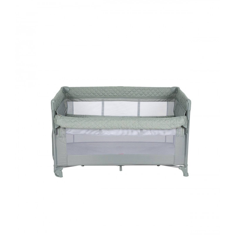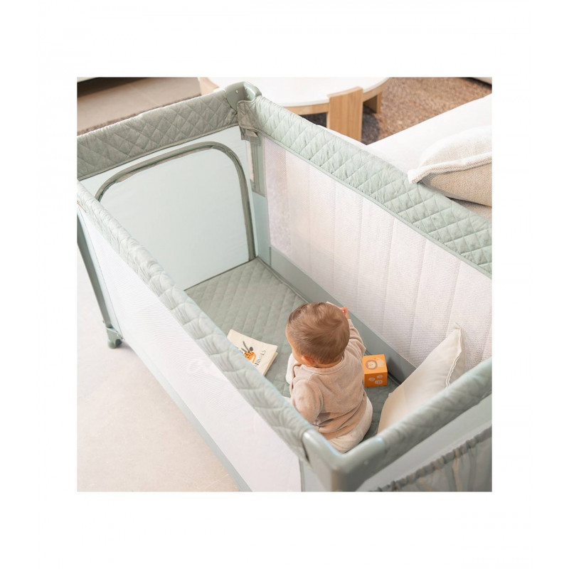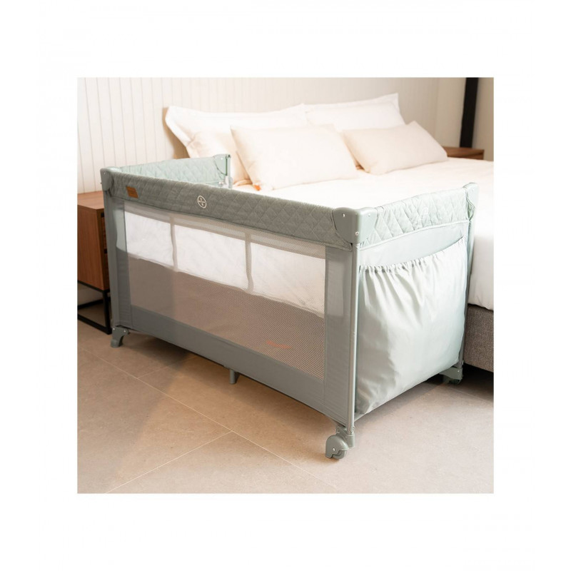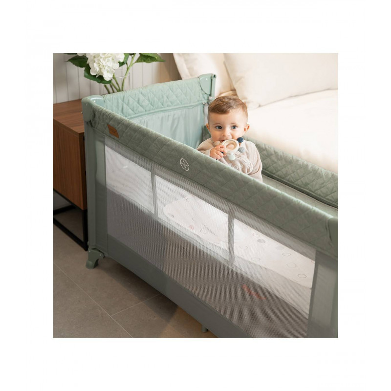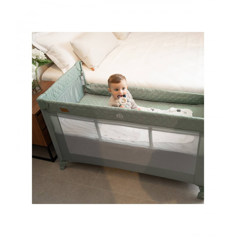 Se adapta a cualquier cama fijándose de forma segura gracias a su altura regulable y sus laterales abatibles. Además, se transforma en un parque de juegos y viene con una bolsa de transporte, convirtiéndose en la solución ideal para el descanso y el juego de tu bebé.