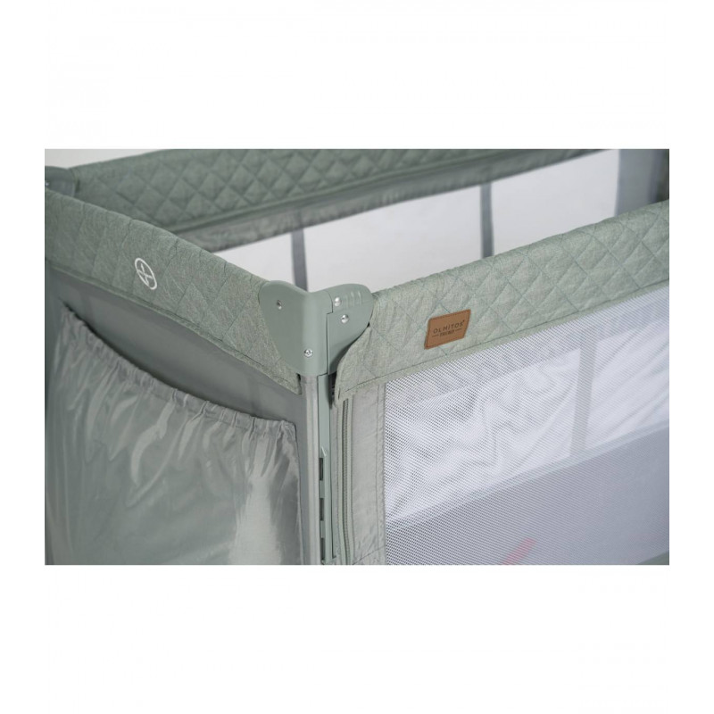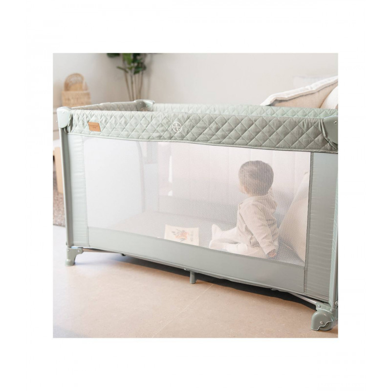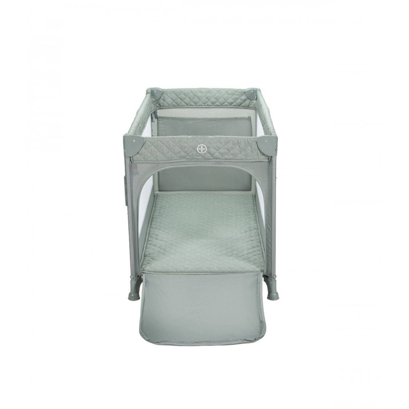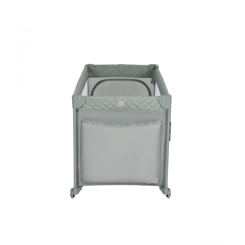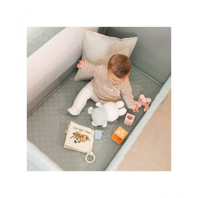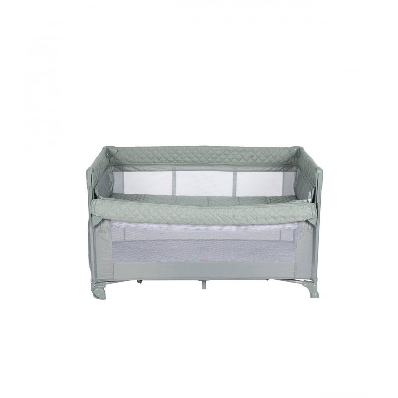 Se adapta a cualquier cama fijándose de forma segura gracias a su altura regulable y sus laterales abatibles. Además, se transforma en un parque de juegos y viene con una bolsa de transporte, convirtiéndose en la solución ideal para el descanso y el juego de tu bebé.