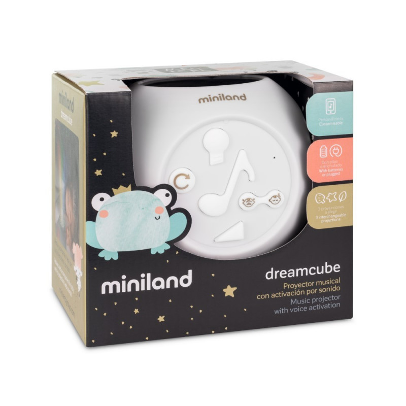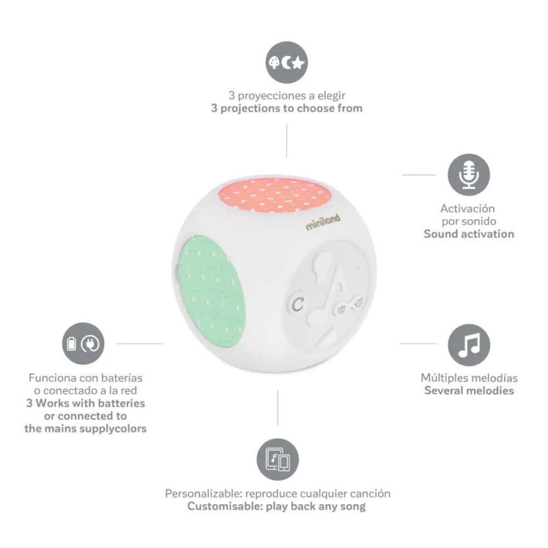 dreamcube se adapta a las necesidades de cada bebé y papá. Las melodías y las proyecciones pueden usarse combinadas o de manera independiente, de forma que el bebé podrá disfrutar sólo de la proyección, de la música o de la combinación de ambas según se desee.