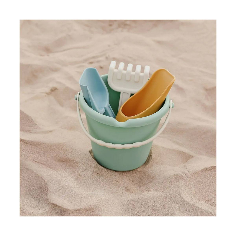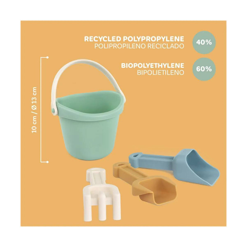 Juego de cubo, pala, pala harinera y rastrillo, con dimensiones adaptadas para bebés a partir de los 18 meses. Idóneo para jugar en la arena o en la nieve. Está fabricado con materiales eco-friendly, respetuosos con el medioambiente. Todas las piezas pueden guardarse y transportarse en el interior del cubo. Máxima resistencia y durabilidad.