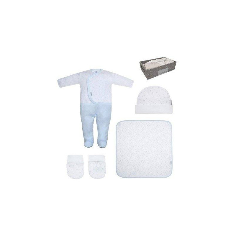 El Juego de primera puesta de 5 piezas de Cambrass, de algodón 100%, consta de jubón cruzado+polaina, manoplas, gorro y manta. Se trata de un conjunto de 5 piezas especialmente indicado para el recién nacido (ideal para incluir en la canastilla para el hospital) ya que, además del jubón+polaina, ofrece una protección extra para las mano, la cabeza y una mantita para envolver al bebé los primeros días de vida.