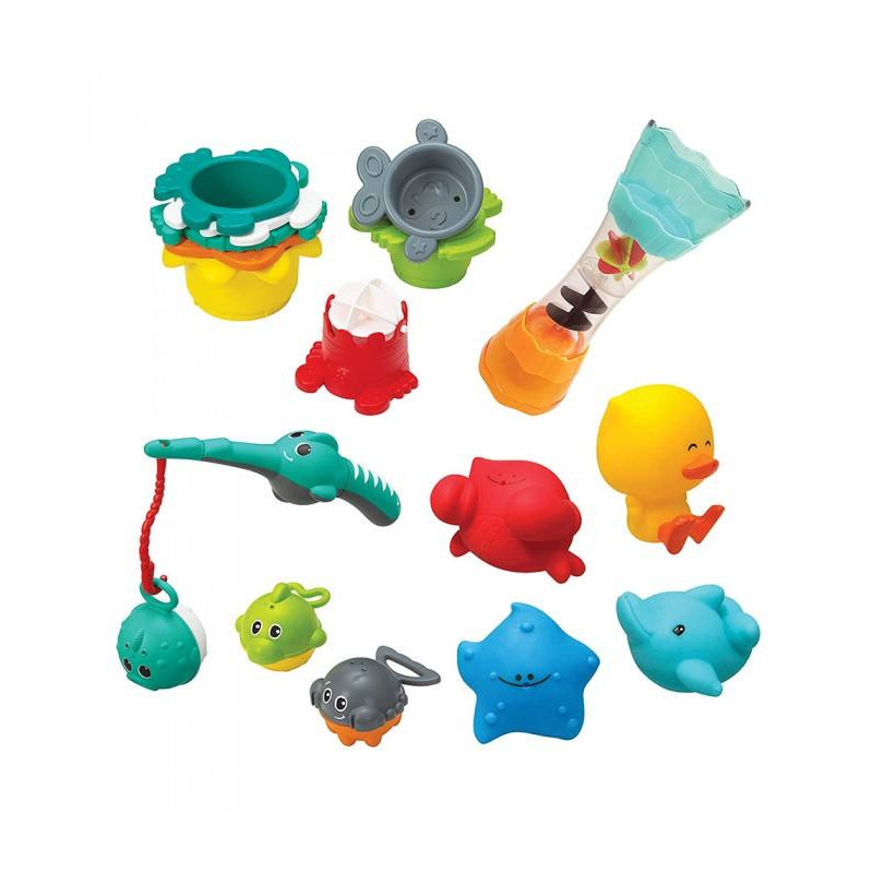 Los vasos apilables con tema de vida marina presentan los números del 1 al 8, y los fondos perforados permiten el juego de goteo de agua.
