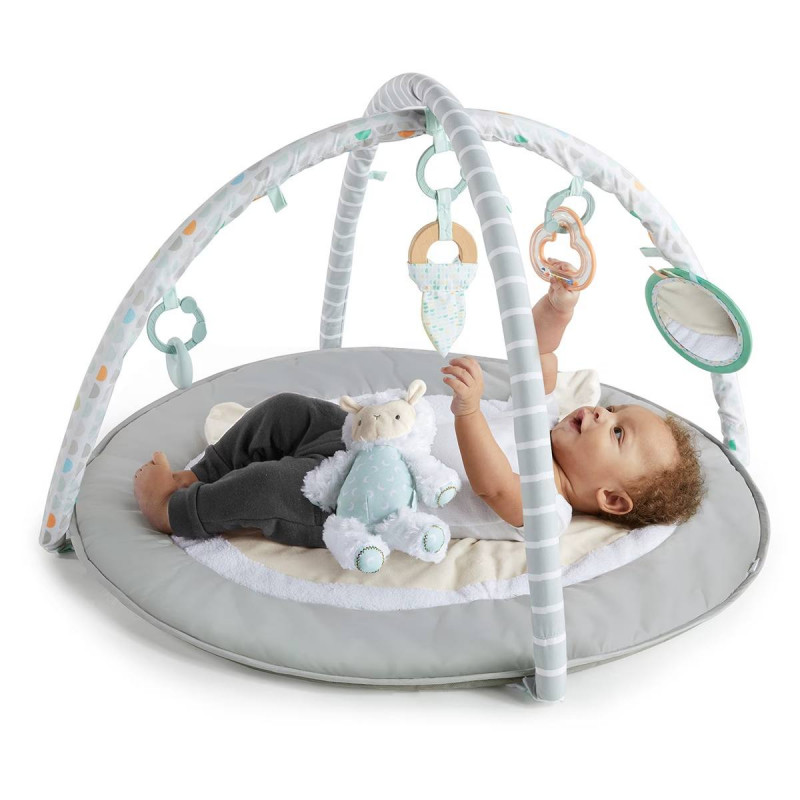 Cuando tu bebé esté listo para jugar, la manta de actividades Sheppy's Spot™ de Ingenuity será un lugar cómodo y seguro en el que podrá pasar el rato tanto tumbado boca abajo como sentado o jugando. Esta manta es tan suave como el algodón y cuenta con un cojín de apoyo que servirá como refuerzo extra para el cuello de bebés de cualquier edad cuando estén tumbados boca abajo. Los 5 muñecos que cuelgan del arco de actividades extraíble harán las delicias de cualquier bebé; un peluche Sheppy™, un anillo de madera natural con tejido estimulante, juguete de silicona natural, espejo con lazos, y sonajero que facilita la relajación y el entretenimiento. El peluche Sheppy™, el nuevo mejor amigo de tu bebé, tiene el tamaño perfecto para que os lo llevéis a todas partes y haga de compañero de juego estéis donde estéis. Esta bonita manta está diseñada para combinar con cualquier decoración, colorida o neutra, de inspiración animal o temas naturales. También es fácil de limpiar, puede guardarse fácilmente en cualquier sitio o llevarse a todas partes; basta para ello con desenganchar el arco de actividades. Las ovejas cuidan a sus crías igual que nosotros y recuerdan los momentos especiales durante años. Confía en la oveja Sheppy como compañera de los mejores momentos de toda tu familia durante años.
