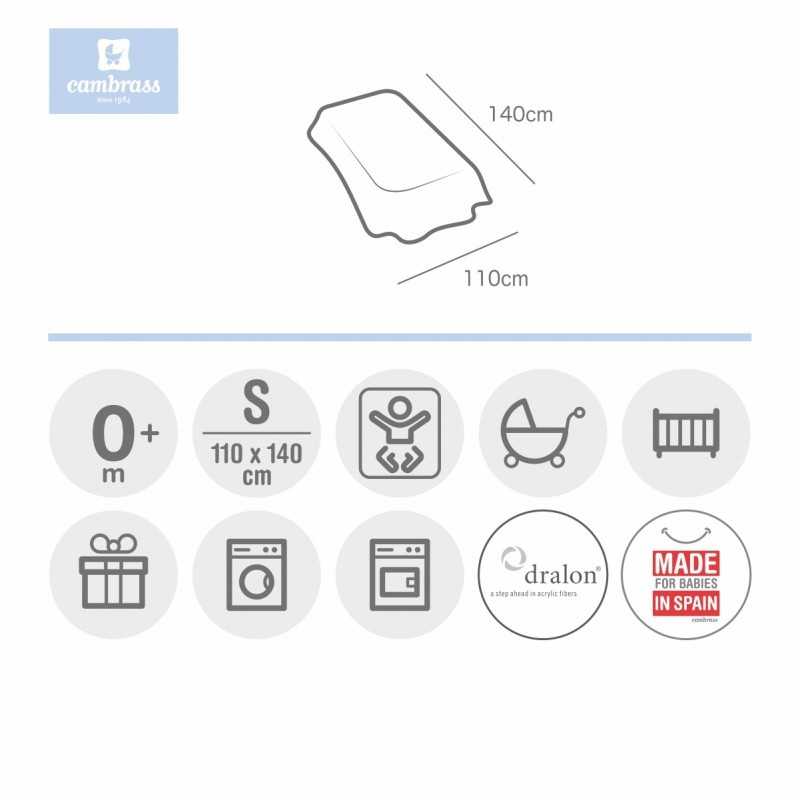La Manta raschel de Cambrass, de tacto suave y aterciopelado, sirve para cunas (de 60x120 o 70x140). Sirve para cubrir al bebé mientras descansa ayudándole a mantener su calor corporal y protegiéndole del frío gracias a las fibras de Dralón con el que está tejido. Además también se puede utilizar como manta de juego.