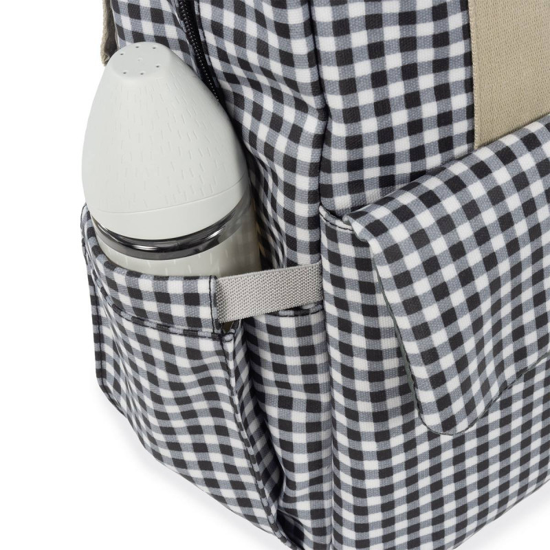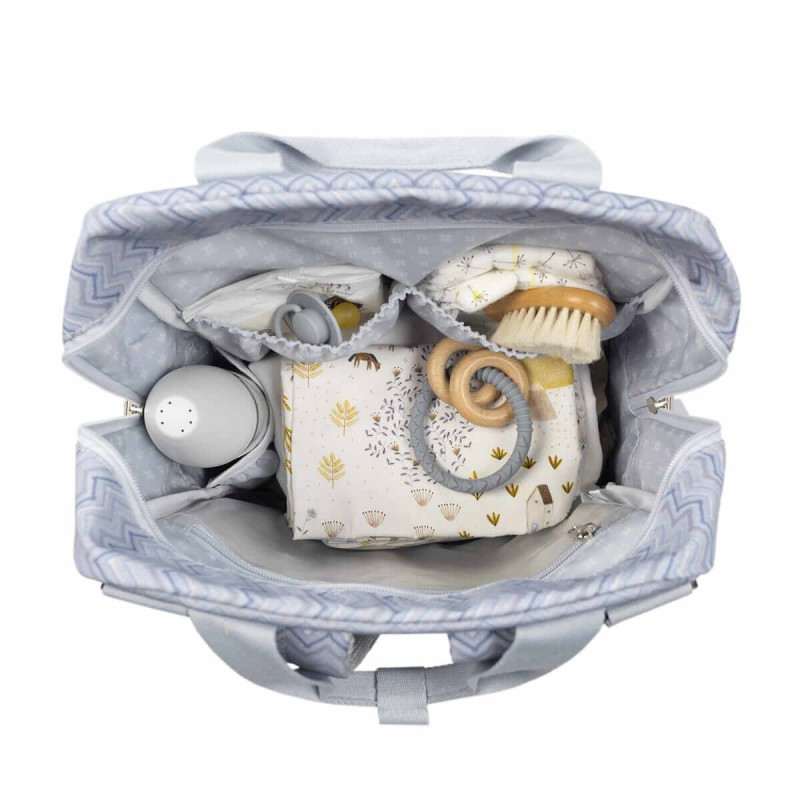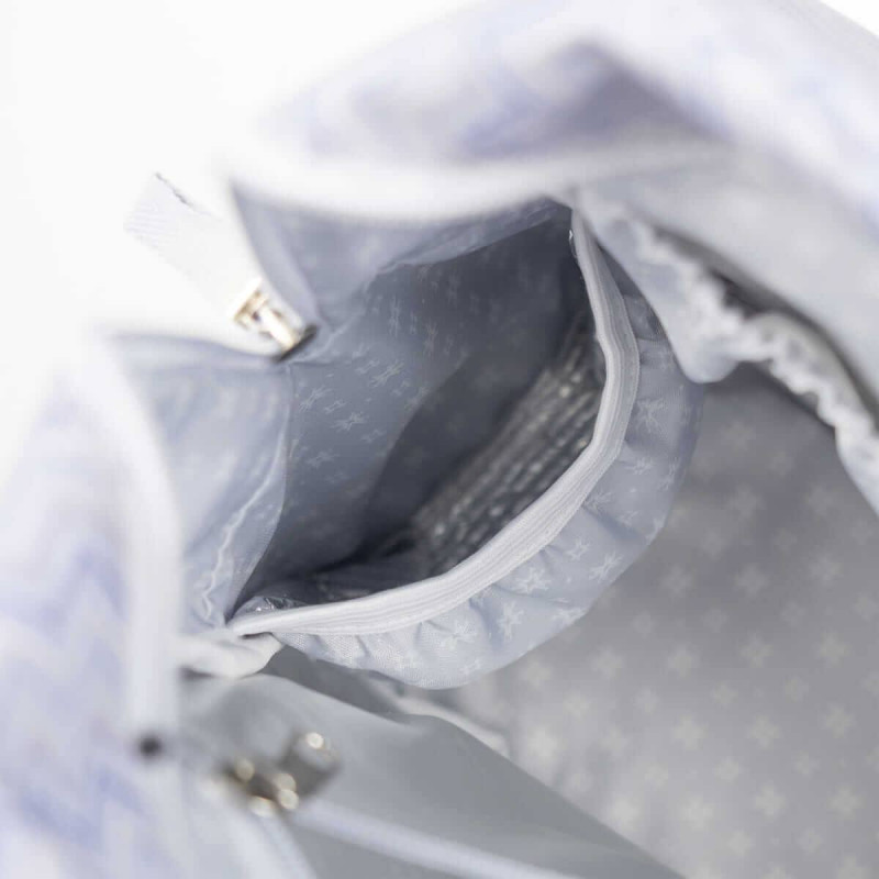 Su esquema ofrece múltiples bolsillos exteriores e interiores para poder tener todo ordenado y a mano. Tiene bolsillos para guardar los biberones y mantenerlos seguros, elásticos para colocar cubiertos, para las toallitas húmedas, también tiene un funda para la botella de agua y otros más.