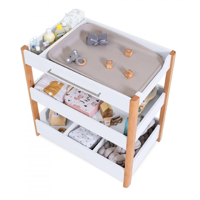 El cambiador de bebé de madera Dadá será tu mejor compañero a la hora de cambiar y asear a tu bebé. Se trata de una cómoda de 96,5 cm de alto que incluye estantes, perfectos para poder tener todo lo necesario del bebé siempre a mano (pañales, cremas, colonias...). Es tablero cambiador bebé permite acoplar un cambiador de tela o silicona en la parte superior de medidas 50x80 cm o 50x70 cm. Incluye un colgador en el lateral para colocar una toalla. Además, se le pueden añadir una ruedas opcionales para poder moverlo por la casa con facilidad.