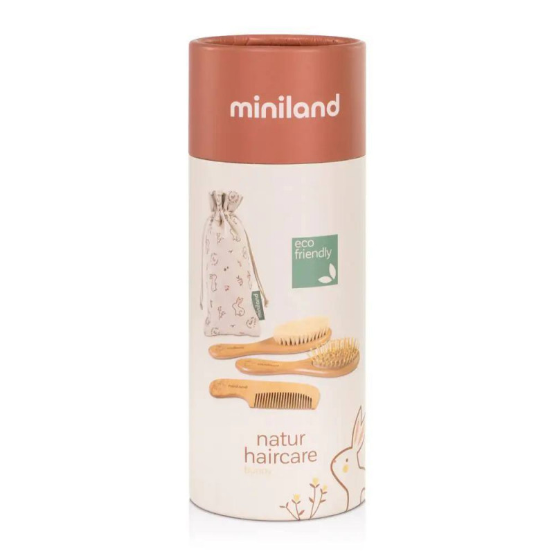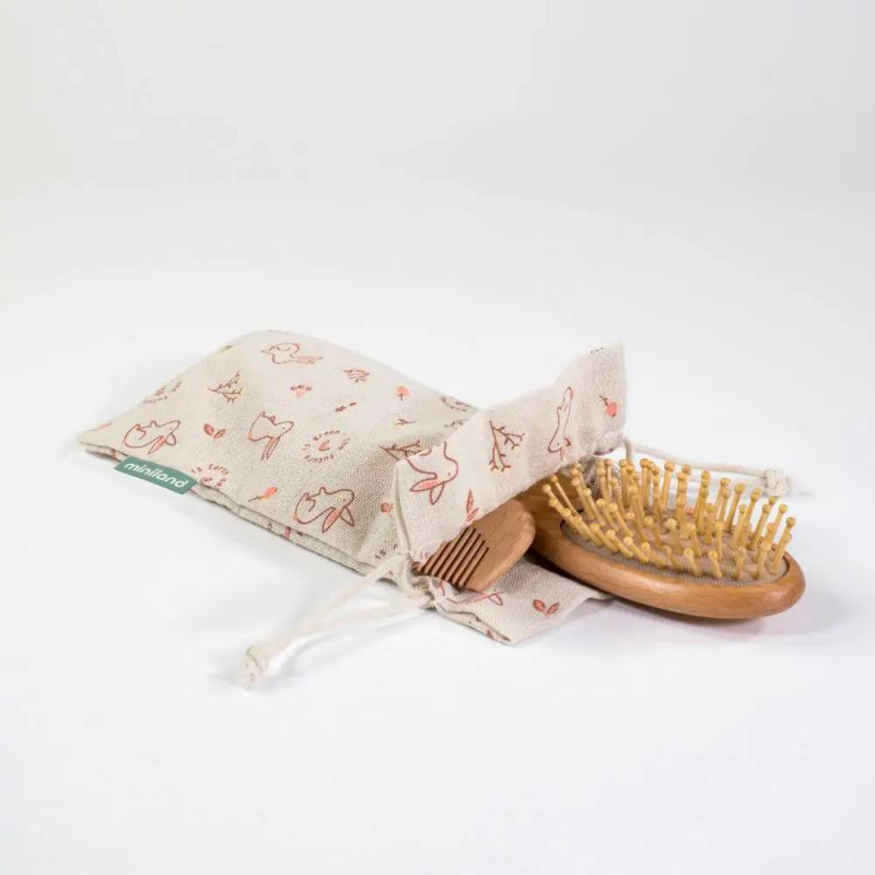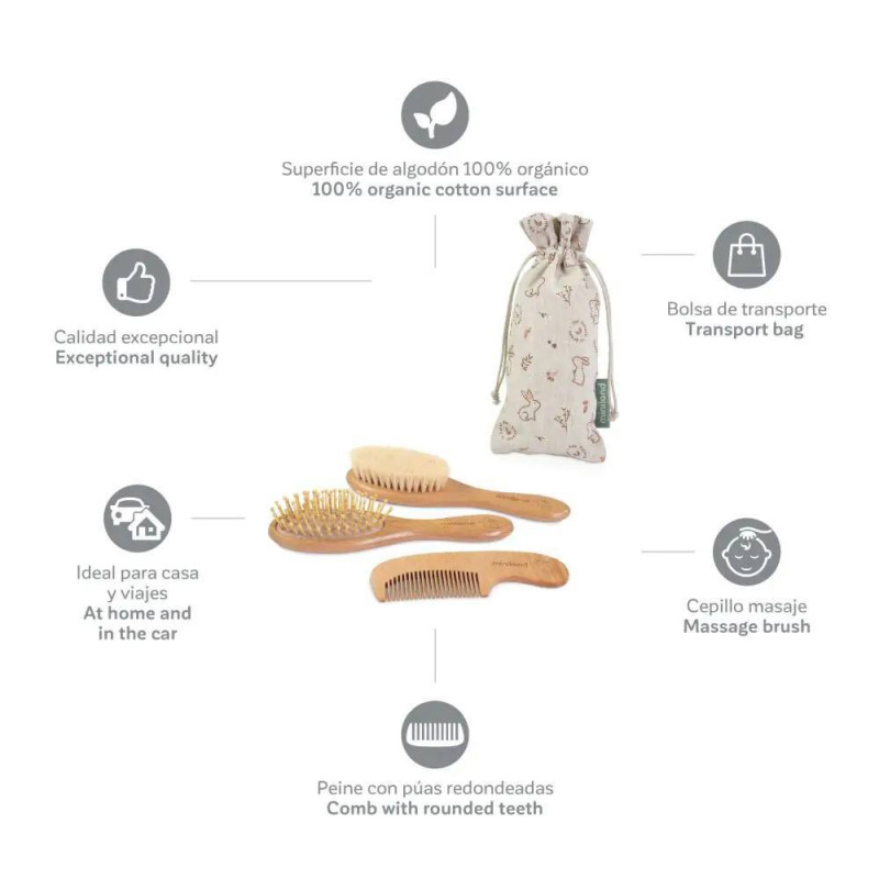 El juego de cepillos y peine están realizados en madera y otros componentes 100% naturales para un cuidado delicado del bebé sin tirones. Son antiestáticos, no quiebran el cabello y además respetan el medio ambiente.