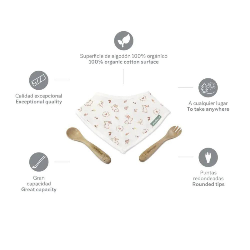 Perfecto para disfrutar de la comida en cualquier parte, este juego eco-friendly incluye una cuchara y tenedor de madera natural y un pañuelo de algodón orgánico para guardarlos, todos hechos de materiales orgánicos. ¡ Cuidamos a los pequeños, cuidamos el planeta!