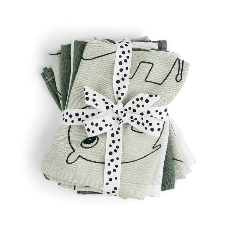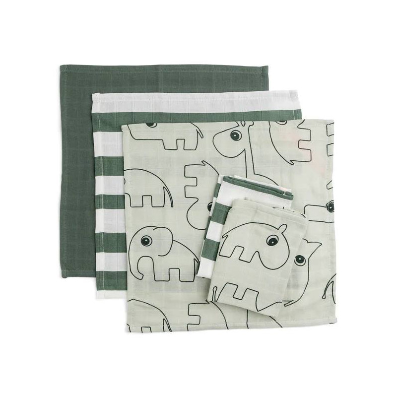 Un paquete de cinco prácticas toallitas de tela en una mezcla de colores sólidos, rayas y un lindo estampado de Deer friends. Un bebé esencial para todo uso, perfecto para lavar suavemente la cara de su pequeño a la hora de comer, bañarse, cambiarse o mientras viaja.