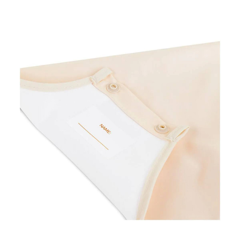 El diseño incluye goma elástica en los puños, que evita que los líquidos o restos de comida entren en contacto con las mangas, y un cierre de presión con dos botones en el cuello, ajustable para mayor comodidad según la talla del peque. Además, cuentan con un amplio bolsillo recoge migas que ayuda a mantener las superficies limpias y atrapar cualquier derrame. Un detalle práctico es la etiqueta personalizable, que permite escribir el nombre del niño o niña, ideal para evitar confusiones en la guardería o en casa.