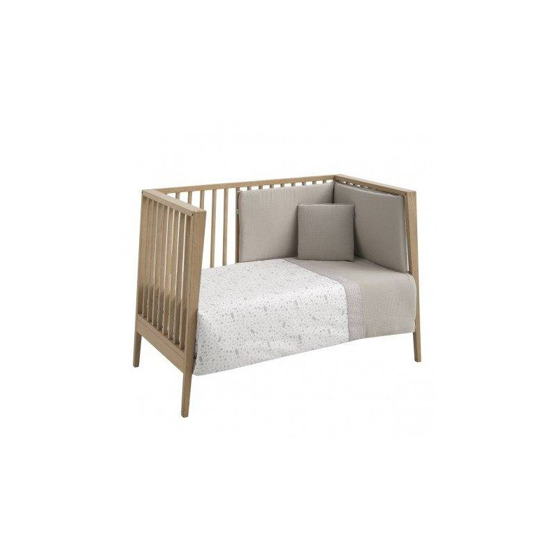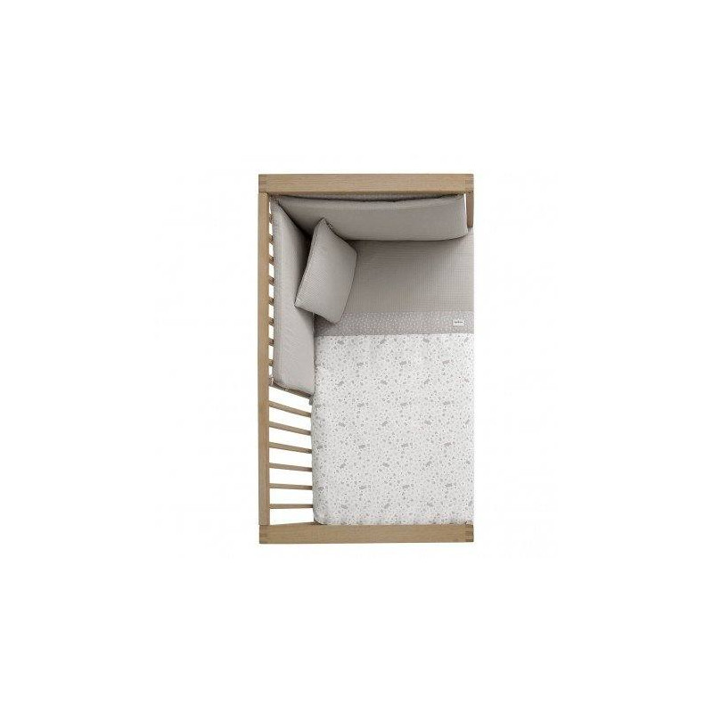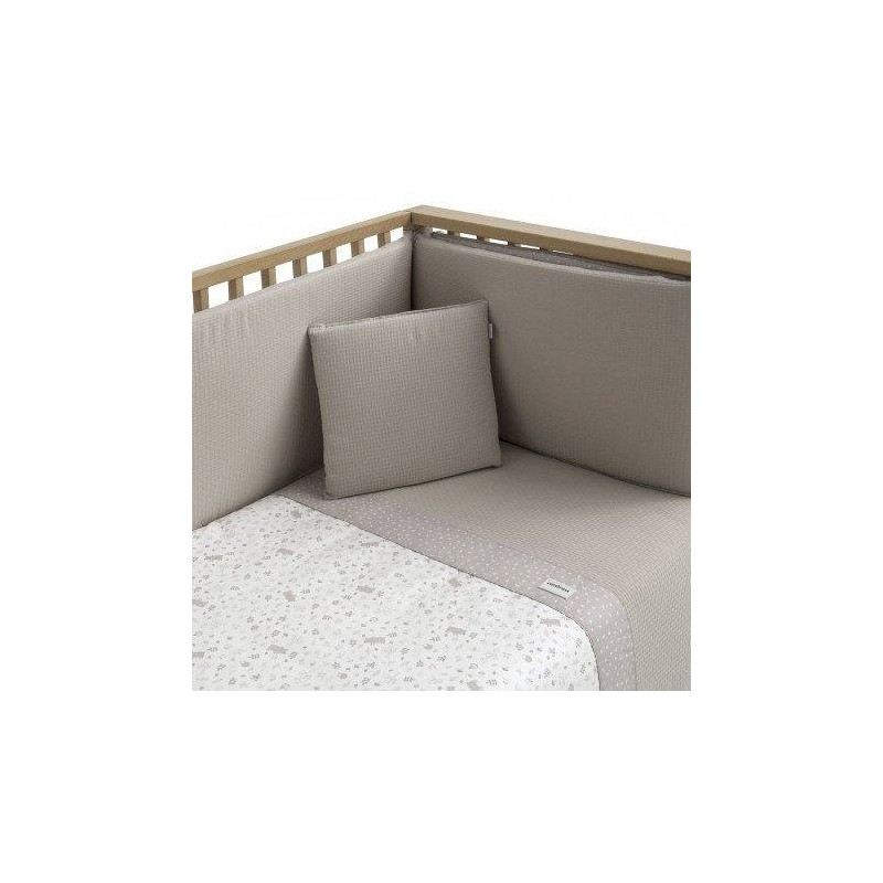 Juego de 2 piezas para vestir la cuna, compuesto por funda nórdica más protector (incluye el relleno) + cojín decorativo. La funda nórdica, es la prenda que viste la cuna y cumple el cometido de protección contra el frío cubriendo a nuestro bebé con una prenda que al incorporar el relleno, la hace especialmente confortable y calidad para sus primeros meses de vida. Su cualidad de tener un relleno desenfundable la convierte en una prenda versátil para ser utilizada en invierno y en verano y también ofrece la ventaja de ser lavada con facilidad. El protector fabricado con tejido cuyo interior va acolchado con fibra hueca, amortigua los posibles golpes del bebe contra la cuna.
