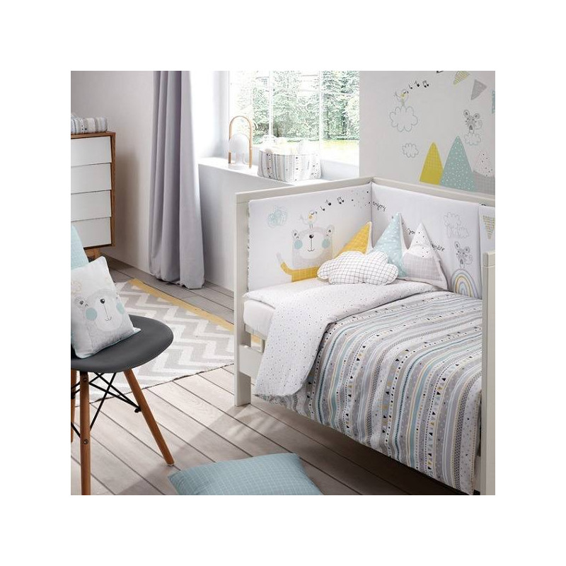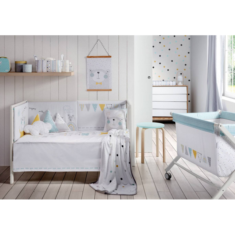 Este conjunto de Protector y colcha de cuna de la colección Party de la marca Petit Praia, fabricado en España.