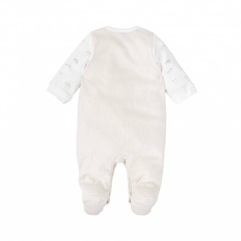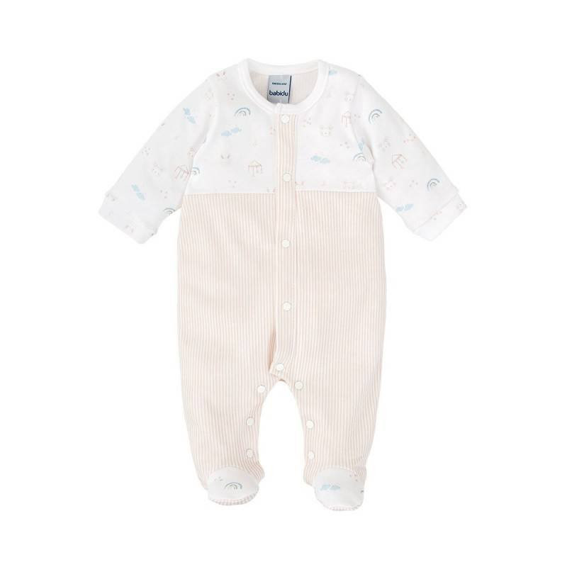 El cierre frontal completo con corchetes facilita el cambio y la colocación, mientras que los pies integrados y los puños con vuelta aseguran abrigo y confort durante todo el día.