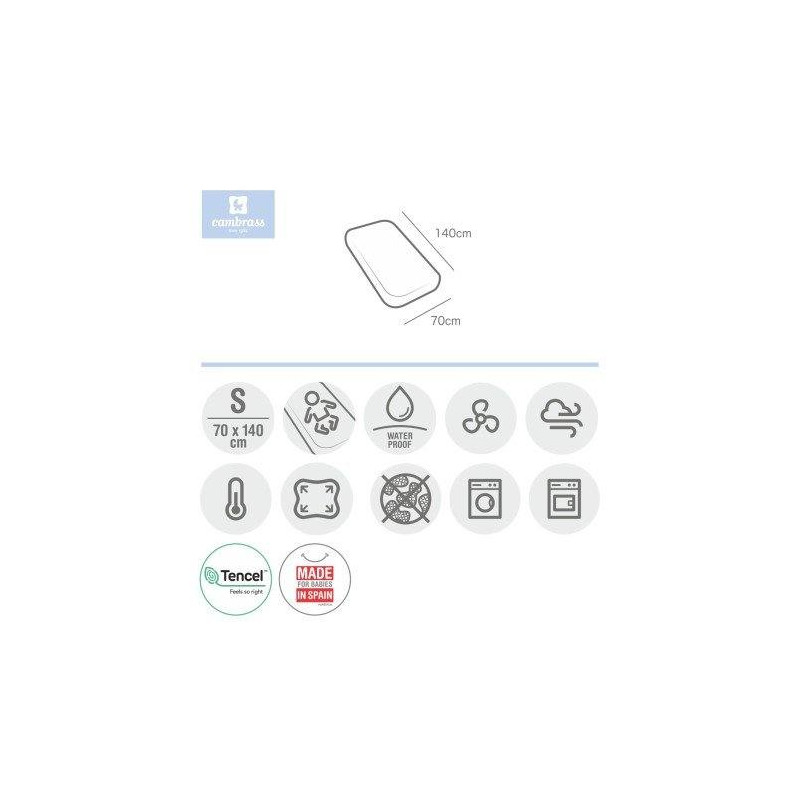La sábana ajustable confeccionada con fibras de TENCEL'! (para cuna 70) de Cambrass funciona como una práctica bajera al adaptarse al colchón por los laterales con su goma elástica, es impermeable y transpirable. Su fabricación con fibras de TENCEL'! 100% garantiza el confort y el bienestar durante el descanso por su impermeabilidad y transpiración, además ofrece una protección antimicrobiana de larga duración, evita la aparición de malos olores, es hipo alergénica y termorreguladora. Fibras botánicas y ecológicas que aportan absorción, suavidad y frescura.