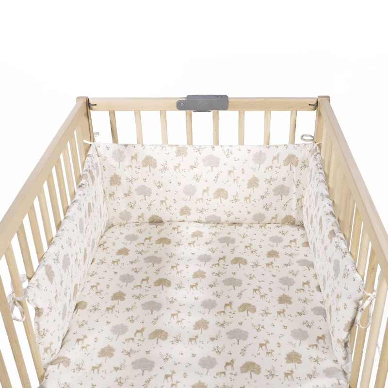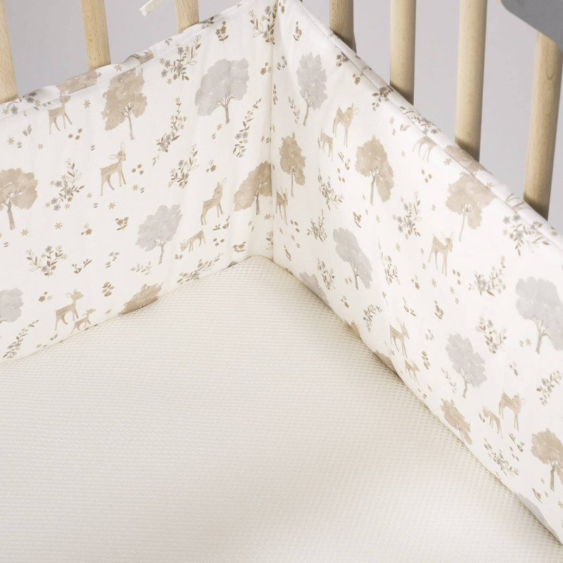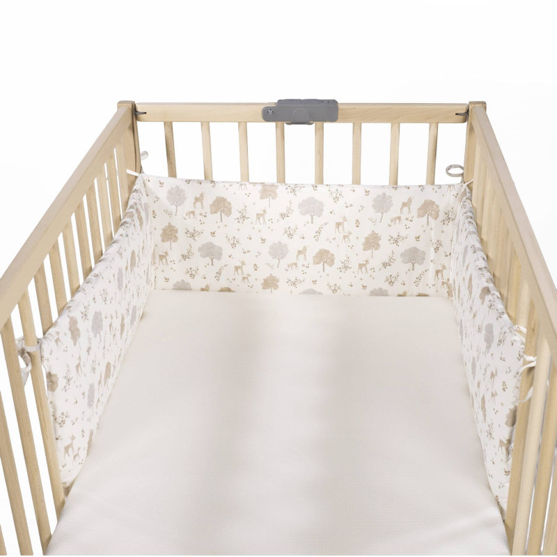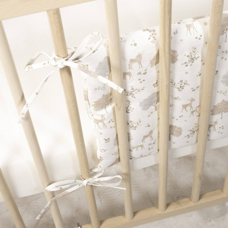 Asegura un entorno de sueño seguro y acogedor para tu bebé con el delicado protector de cuna de la exclusiva colección Nara de Pasito a Pasito. Diseñado para cunas de 120×60 cm, este protector combina la máxima protección con un diseño encantador y una transpirabilidad superior. Diseño «Nara» inspirado en la naturaleza: el protector presenta un hermoso y sutil estampado de ciervos y árboles en tonos neutros y suaves (beige, gris claro, blanco), que evocan la serenidad del bosque. Un diseño atemporal y elegante que complementa cualquier decoración de la habitación del bebé. Confeccionado en algodón 100%: su exterior está elaborado con algodón 100%, garantizando una suavidad excepcional al tacto y el máximo cuidado para la delicada piel de tu bebé. Interior de rejilla 3D transpirable: pensando en la seguridad y el confort, el interior cuenta con rejilla 3D altamente transpirable. Esta característica esencial permite una circulación de aire óptima, reduciendo el riesgo de asfixia y la acumulación de calor, y asegurando un ambiente de sueño seguro. Protección suave y efectiva: este protector acolchado crea una barrera suave entre el bebé y los barrotes de la cuna, previniendo golpes y que las extremidades queden atrapadas entre ellos, garantizando un descanso tranquilo para padres e hijos. Ajuste perfecto para cunas estándar: especialmente diseñado para cunas de 120×60 cm, se fija fácilmente a los barrotes mediante lazadas, asegurando una sujeción firme y estable. Cumple con la Normativa de Seguridad EN-16780: la tranquilidad es primordial. Este protector de cuna cumple con la rigurosa normativa europea EN-16780 Requisitos de seguridad y métodos de ensayo para los protectores de cuna infantiles, lo que certifica su seguridad y adecuación para el uso en cunas de bebé. El protector de Cuna Nara no solo es un elemento de seguridad indispensable, sino también un hermoso detalle decorativo que aporta calidez y armonía a la habitación de tu bebé. Su confección de alta calidad asegura durabilidad y fácil mantenimiento. ¡Ofrece a tu bebé un descanso seguro, cómodo y con estilo con el Protector de Cuna de la colección Nara de Pasito a Pasito! Todos nuestros productos están fabricados conforme a las más exigentes normativas europeas, con materiales de gran calidad, libres de colorantes azoicos, ftalatos y sustancias nocivas para la salud. Tela de fácil limpieza, se recomienda lavar a máquina a 30º. Los productos para bebé de Pasito a Pasito cuentan con un diseño muy diferente a todas las demás. Sus colecciones se caracterizan por el trabajo al detallada, pensadas siempre desde un punto de vista práctico. Utilizan materiales de primera calidad para remarcar la elegancia y la armonía en cada una de sus piezas. Nuestros modelos son exclusivos y de estilo inconfundible, pensados en las madres actuales que gozan de buen gusto y que aprecian los detalles tanto como nosotros. Medidas:180×30 cm.