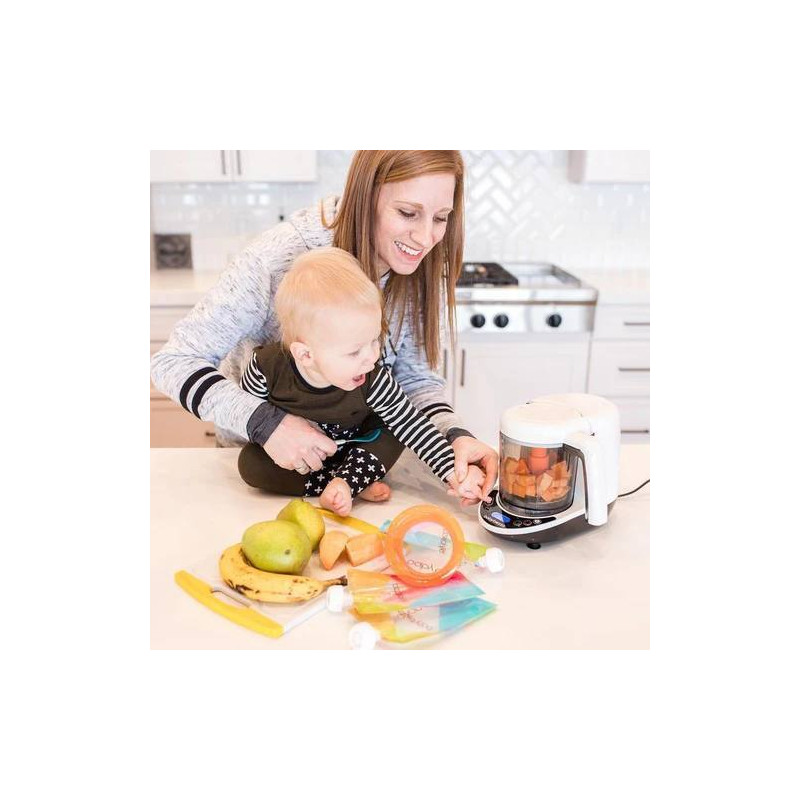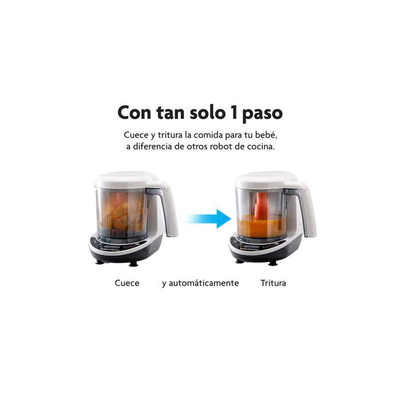 El único robot de cocina que cocina al vapor y mezcla los alimentos en un único paso, solo apretando un botón. No requiere realizar otros pasos después del cocinado como otros robots de cocina ya que automáticamente pasa de cocinar a triturar.