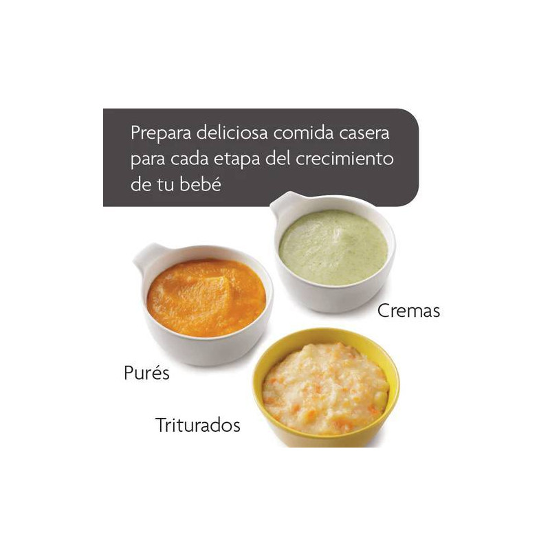 4 aspas de acero inoxidable mezclan los alimentos en la textura perfecta para cada fase del desarrollo alimenticio de tu bebé.