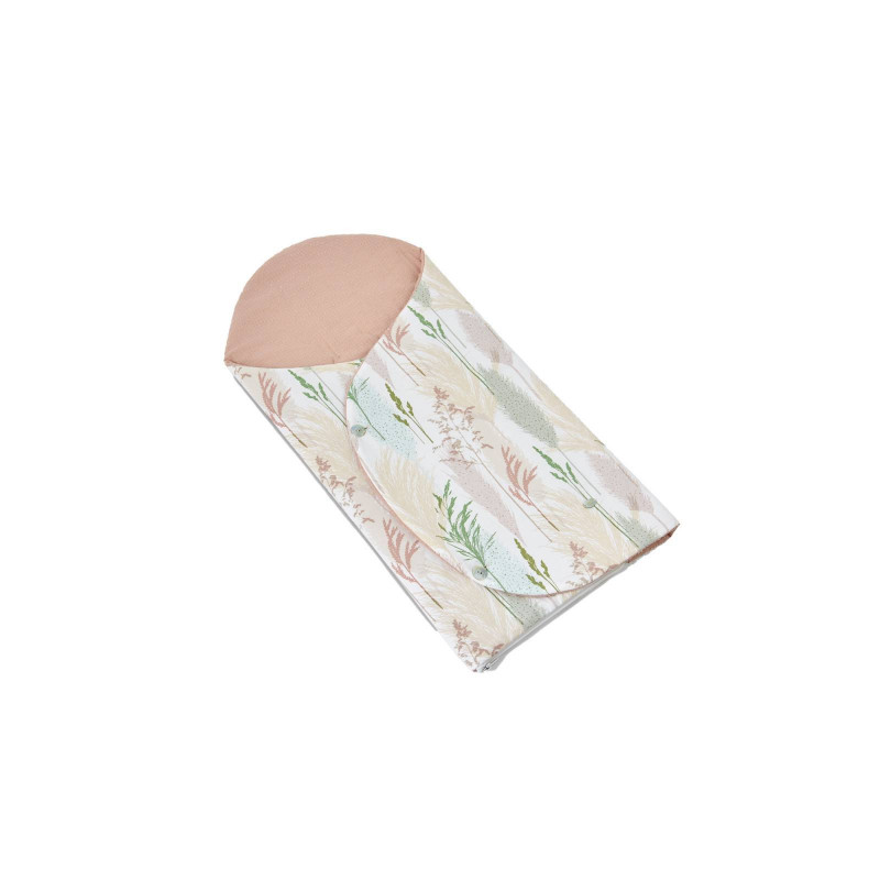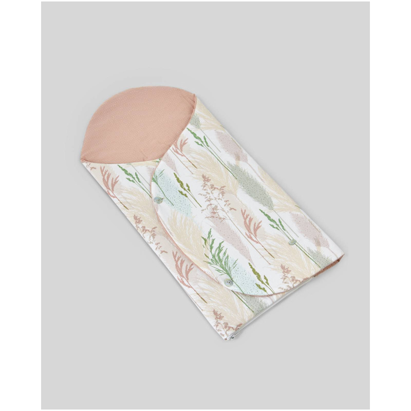 Saco nana de punto de algodón con interior de popelin de estampado vegetal y botones al tono para cerrar. Se abre totalmente para usar de cambiador. Tiene ojales traseros para porta bebé. Ideal para portar al bebé.