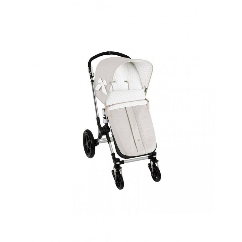 Saco para sillas ligeras o de formato estrecho confeccionado en piqué galleta liso combinado con piqué estampado el interior. Cremalleras laterales para convertir el saco en colchoneta. Refuerzo de polipiel en los pies. Relleno del cubrepiés extraible.