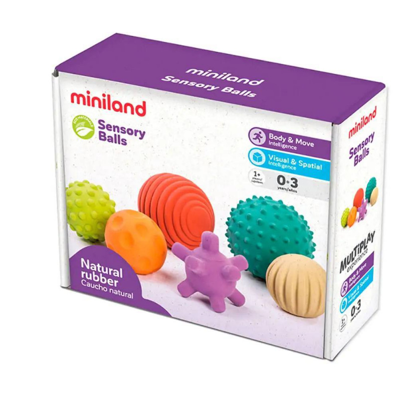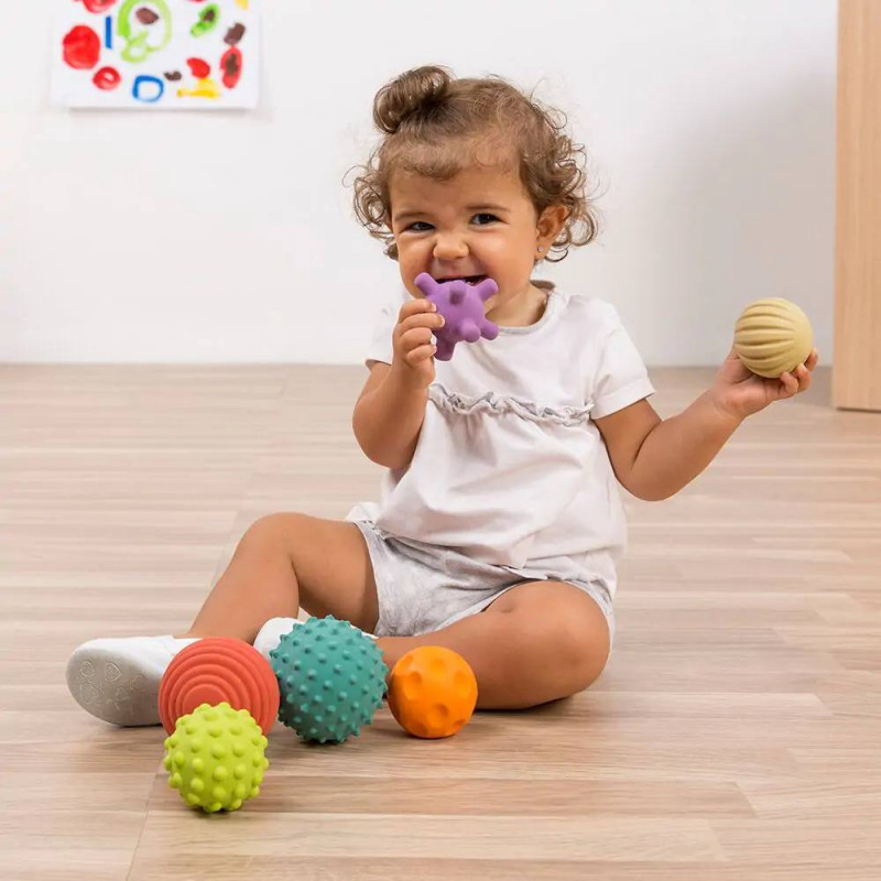 Set de bolas sensoriales fabricadas 100% con caucho natural proveniente de árboles de hevea. Su material natural especialmente suave y blandito hace que sean muy fáciles de agarrar y adecuadas para manipular y morder por los más pequeños. Sus colores y texturas diferentes favorecen la estimulación sensorial -tanto táctil como visual- y contribuyen al desarrollo de las habilidades motoras de los niños y niñas.