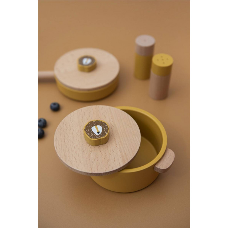¡Empecemos a cocinar! Con este juego divertido con uno de nuestros amigos animales, tu hijo se divertirá durante horas preparando las sopas y cenas más locas. El juego consta de una olla, una sartén, un juego de sal y pimienta, cuchara y tenedor. ¡Simplemente agregue el ingrediente secreto de la imaginación y listo! El juego de cocina está hecho de madera 100% certificada FSC®. Todas las pinturas de este producto son a base de agua, seguras para los niños y no tóxicas.