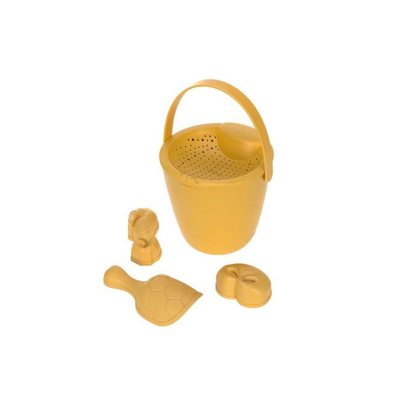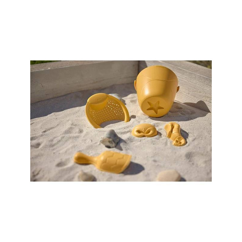 Compuesto por: cubo con asa, dos moldes (uno con forma de caballito de mar y otro con forma de congrejo), una pala con forma de tortuga y colador con forma de pulpo.Proporciona diversión y permite la experimentación.