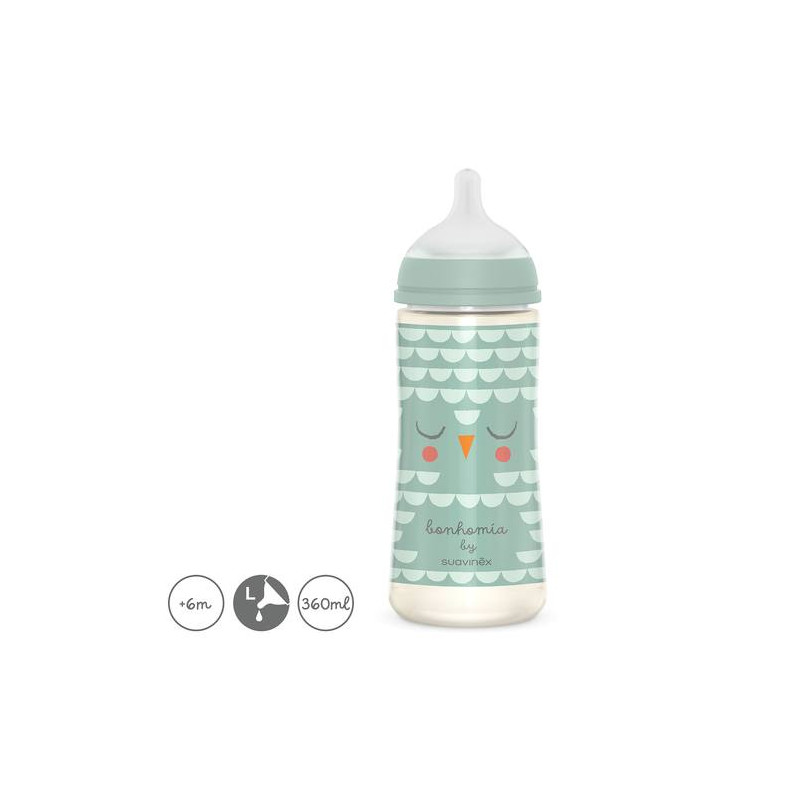 Biberón de 360 ml con tetina fisiológica de silicona SX Pro de Flujo Denso (L), con válvula anticólico, para bebés +6 Meses. Deja pasar papillas muy líquidas. Ideal para bebés mayores o muy comilones.