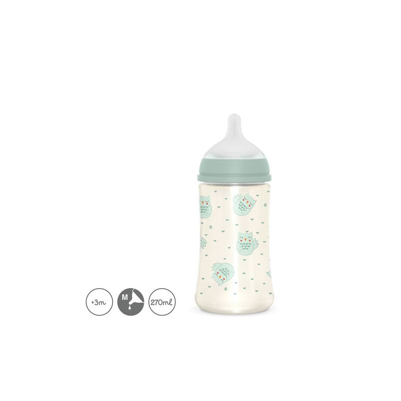 Biberón de 270 ml con tetina fisiológica de silicona SX Pro de Flujo Medio (M), con válvula anticólico, para bebés +3 Meses. Deja pasar todo tipo de líquidos de densidad media, ideal para leche, zumos o agua.