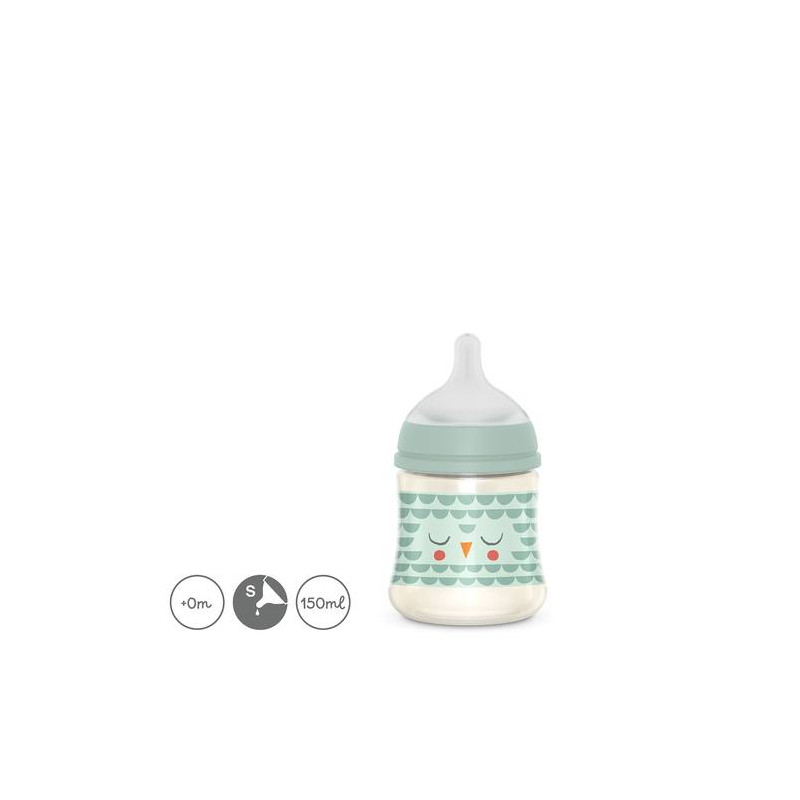 Biberón de 150 ml con tetina fisiológica de silicona SX Pro de Flujo Lento (S), con válvula anticólico, para bebés +0 Meses. Deja pasar poca cantidad de líquido. Indicada para las tomas de leche de los primeros días de vida o para el agua más adelante.