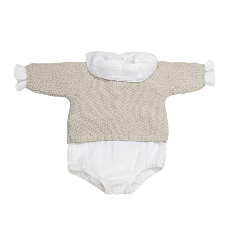 Este set de 3 piezas incluye jersey y ranita en tricot 100% algodón con delicado punto de arroz y acabado de crochet, además de un body interior de bambula lisa, también en algodón 100%. Una propuesta confortable y refinada para los primeros días del recién nacido. Presentado en una bonita caja impresa perfecto como regalo para recién nacido o para completar la primera puesta de tu bebé. Gran calidad y mucho estilo.