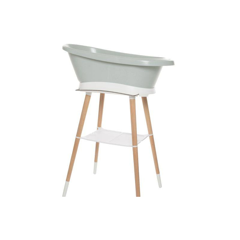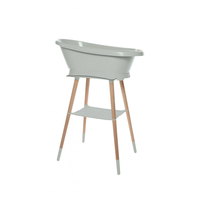 El soporte de baño Sense, muy estable, tiene patas de madera de haya lacada con certificación FSC. Esto le da al soporte del baño un aspecto cálido y moderno. El soporte está equipado con útiles artilugios; se adjunta un toallero en la parte delantera. La espaciosa bandeja de plástico proporciona espacio para, por ejemplo, una botella de champú, toallitas o gel de lavado. Esto significa que tienes todo lo necesario a mano para disfrutar junto a tu pequeño en paz. Un innovador sistema de clic garantiza que la bañera se pueda colocar y quitar fácilmente en el soporte. Después de hacer clic en su lugar, puede bañar a su pequeño sin ser molestado y de forma segura.