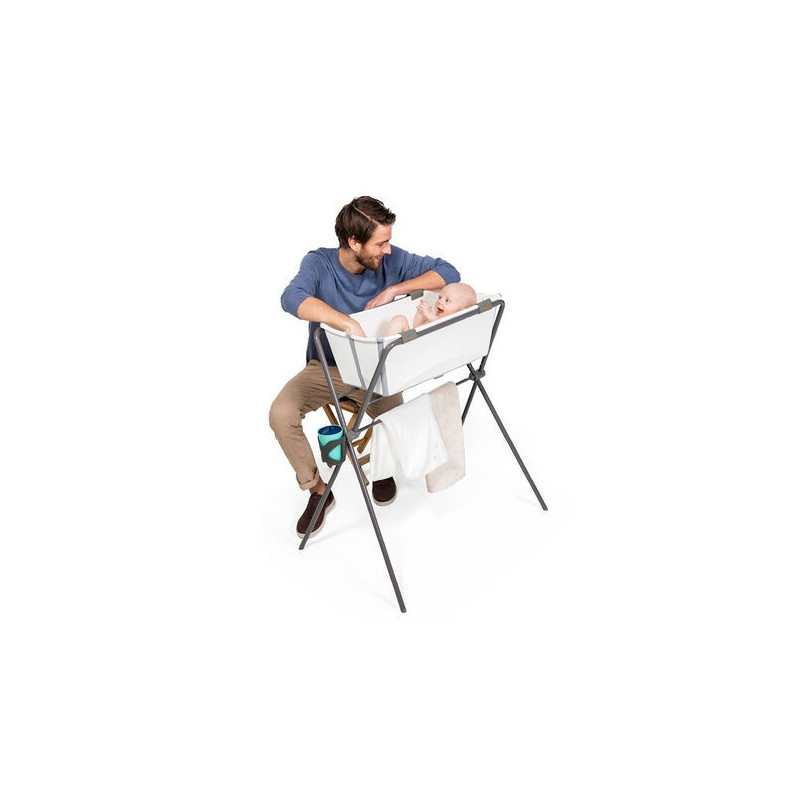 El Soporte Stokke® Flexi Bath® ha sido diseñado para acercarte a tu bebé y estrechar el vínculo divirtiéndoos juntos. Diseñado especialmente para encajar la bañera Stokke® Flexi Bath®, el soporte aporta seguridad, la comodidad de tenerlo todo a mano y es fácil de guardar. El bloqueo de la bañera también sirve para que el soporte permanezca plegado y erguido. También es uno de los primeros en cumplir con las nuevas regulaciones de la UE para soportes de baño (EN 17072: 2018). Se puede usar para bañar al recién nacido hasta que pueda mantenerse erguido por sí solo. Olvídate del dolor de espalda: no te arrodilles más en el suelo gracias a la ayuda de este soporte resistente y ergonómico. Pensado para ser práctico, cómodo y acercarte a tu bebé.
