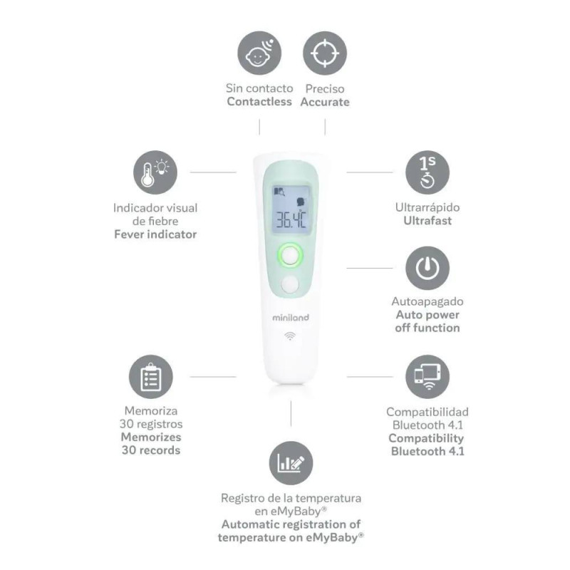 A través de la aplicación eMyBaby, thermoadvanced pharma se comunica con el smartphone y la Tablet para registrar las temperaturas tomadas, pudiendo llevar un seguimiento de las mismas en cualquier momento y lugar. Es posible utilizar el termómetro de forma aislada o con eMyBaby®.