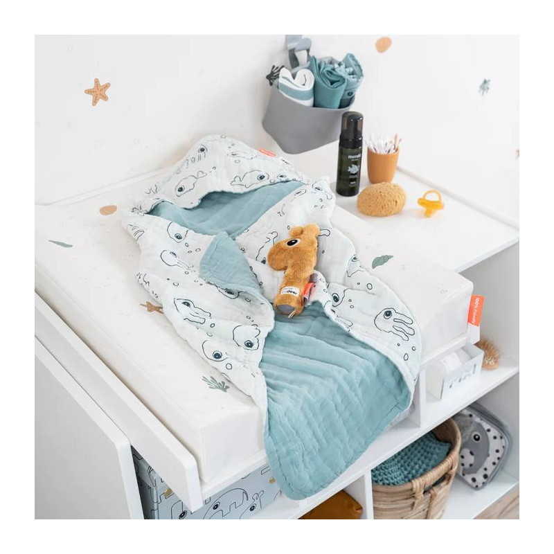 Bienvenida bajo el mar con los amigos Jelly y Wally y sumérgete en un océano de suaves textiles de baño de muselina de varias capas.
