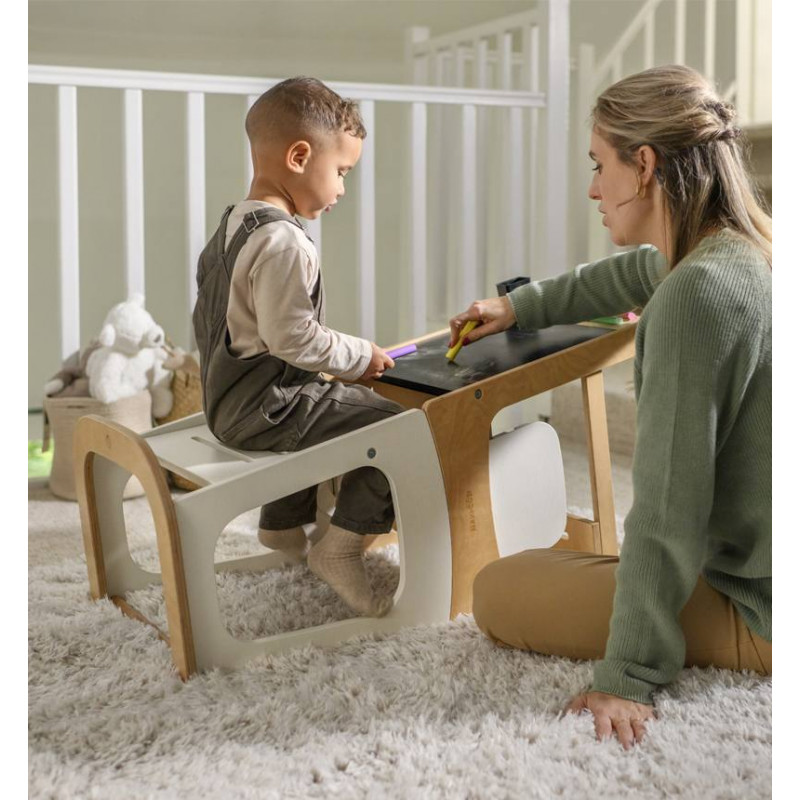 La torre de aprendizaje Toucan 3 en 1 proporciona la plataforma ideal para que tu pequeño participe en las actividades familiares por toda la casa. La altura ajustable garantiza que tu hijo siempre pueda alcanzar la encimera con seguridad y comodidad, mientras que la pizarra integrada le proporciona una salida creativa. Tanto si se utiliza como taburete o en modo mesa y silla, tu pequeño tendrá un cómodo lugar propio donde relajarse, expresar su creatividad o participar en lo que ocurra a su alrededor.