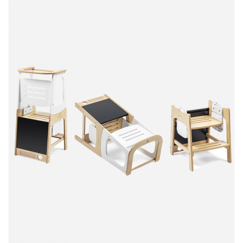 Cambio fácil de un modo a otro: pasar de la torre al juego de mesa y silla es tan fácil como girarla sobre un costado. Para utilizarla como taburete, basta con retirar la parte superior de la torre.