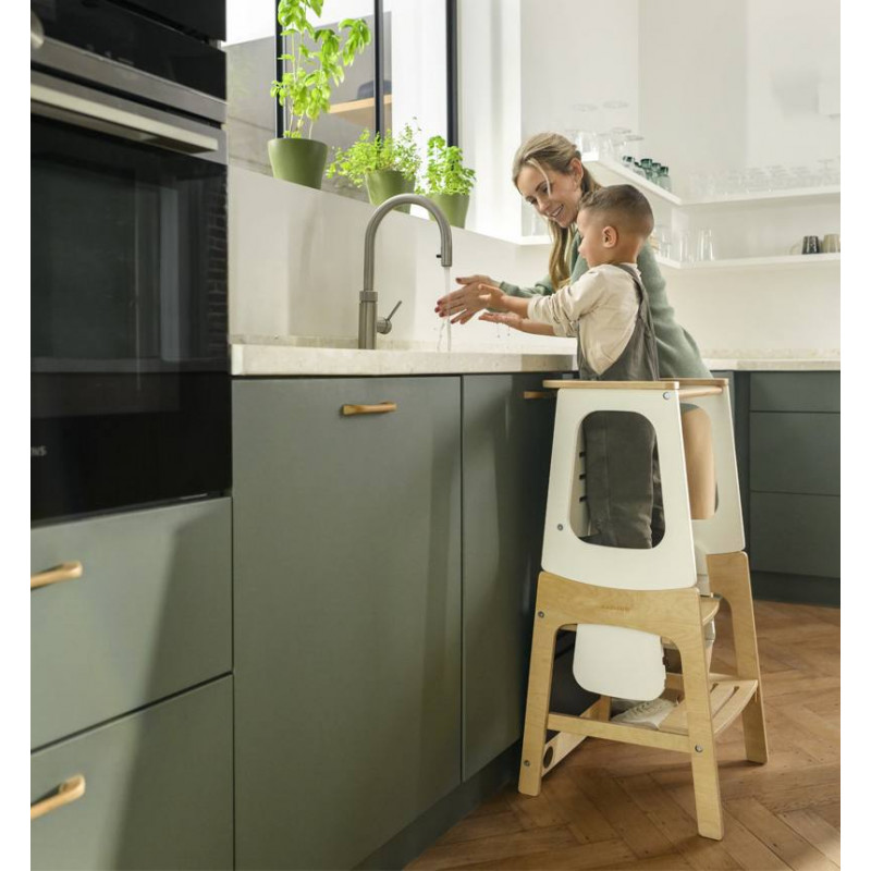 Los niños pueden utilizar Toucan con seguridad en modo torre de aprendizaje desde los 18 meses hasta los 6 años. Construida inspirándonos en el método Montessori, encarna la idea de que los niños aprenden mejor en entornos preparados para permitir actividades independientes. Gracias a su altura regulable, Toucan se adapta a los niños durante sus primeros años de vida, hasta que dejan de necesitar ese aumento de altura. En el modo torre de aprendizaje, tu pequeño ayudante está a salvo de caídas gracias a la barra de seguridad trasera. La versatilidad de Toucan se extiende más allá de la infancia, ya que sirve de taburete tanto para niños como para adultos, con lo que garantiza tener un lugar en tu casa durante años.