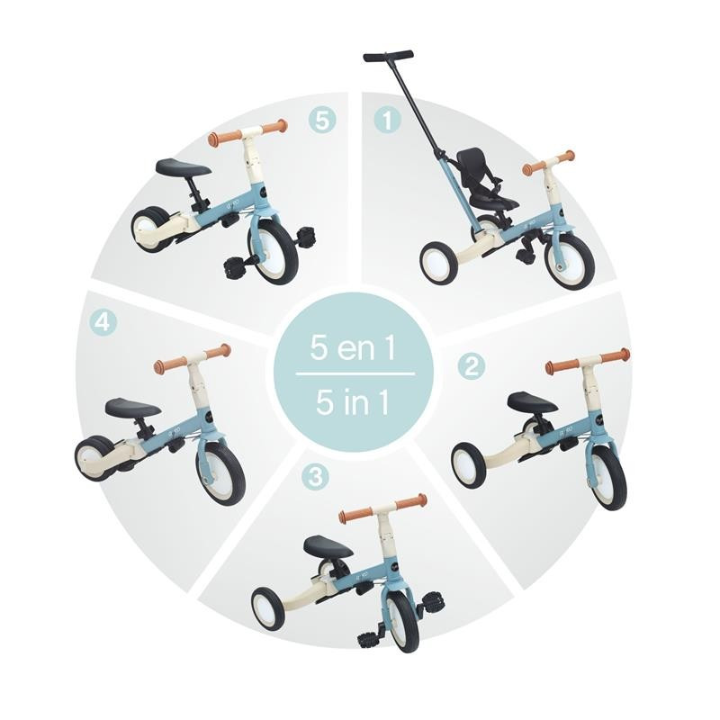 • Provisto de un sencillo sistema que permite transformar la bicicleta sin herramientas y ajustarla a la edad del niño.