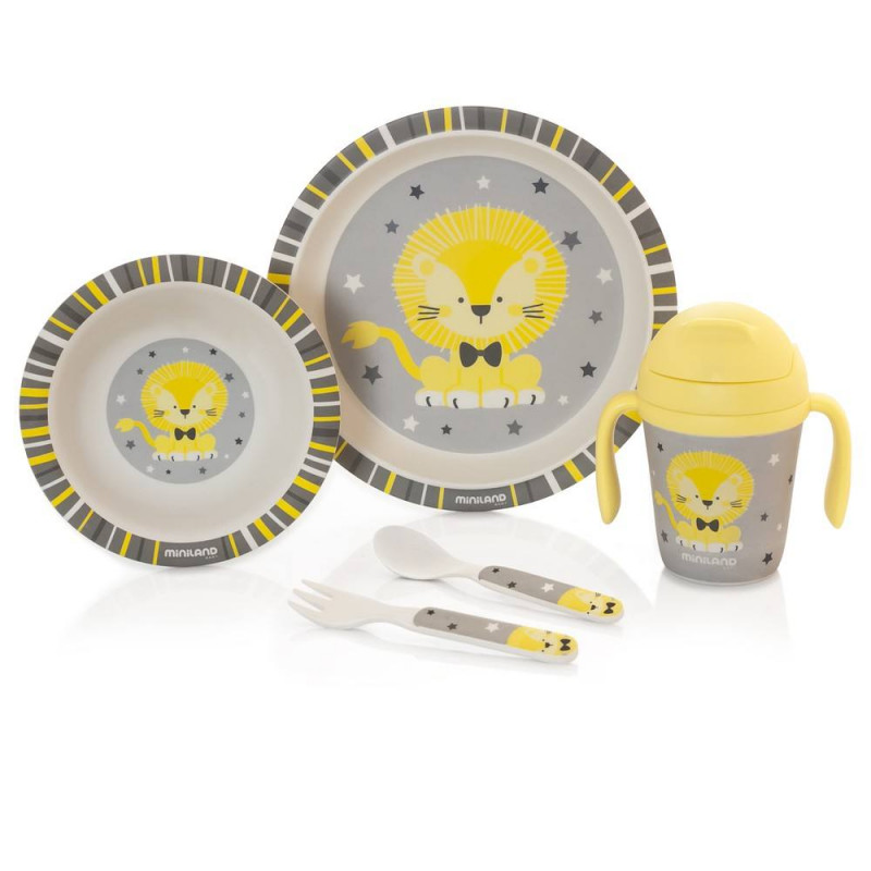 El set de 5 piezas está compuesto por un plato llano para comidas sólidas; un bol ideal para papillas; tenedor y cuchara con tamaño ideal para las primeras comidas del bebé y taza de aprendizaje con cómodas asas, pajita y sistema de cierre antigoteo.