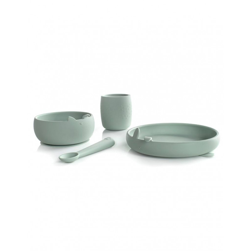 Incluye plato, bol, cuchara y vaso con formas sencillas de animales. Los 4 elementos son apilables entre sí para ocupar el mínimo espacio al guardarlas.