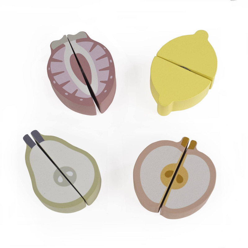 Set completo de 12 piezas: este divertido juego incluye la batidora, una taza, una cuchara y una variedad de frutas de madera (plátano, pera, fresa y manzana) que se pueden «cortar» por la mitad gracias a su diseño con velcro, ofreciendo múltiples posibilidades de juego.
