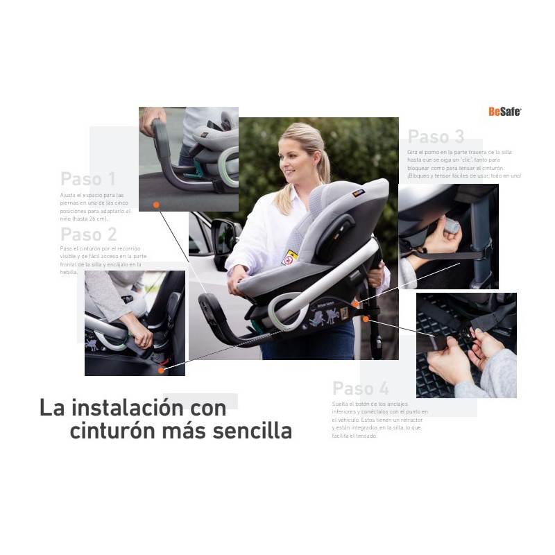 El hecho de que se instale con el cinturón significa que la silla se puede instalar en cualquier posición en el coche, incluso en el asiento del acompañante delantero y en el asiento central trasero. La instalación con el cinturón es intuitiva con varias soluciones inteligentes y la más fácil del mercado.