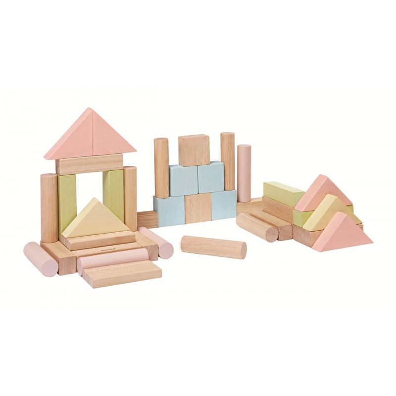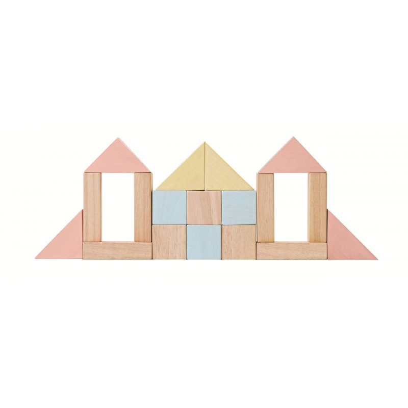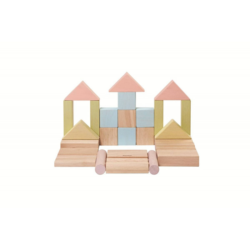 ESTE JUEGO CONTIENE 40 BLOQUES DE MADERA DE 6 FORMAS DIFERENTES (18 PIEZAS EN COLOR PASTEL Y 22 PIEZAS EN COLOR DE MADERA NATURAL).