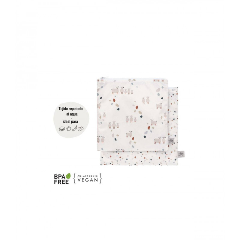 Pack de 2 bolsas reutilizables para guardar los alimentos sólidos como bocadillos, galletas, fruta o sándwiches. Un práctico cierre de cremallera para mantener las propiedades de los alimentos.