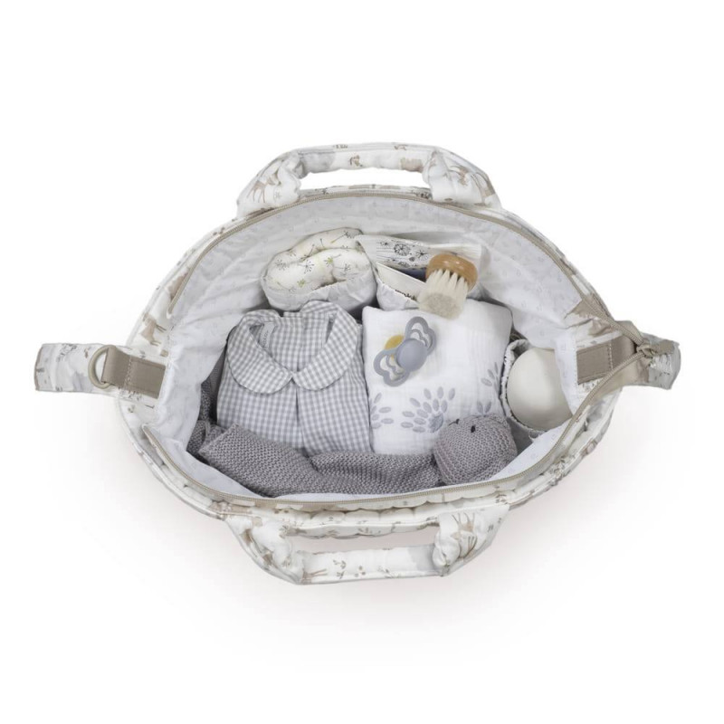 Su tratamiento waterproof la hace resistente al agua, garantizando protección y durabilidad en el día a día. Es un diseño muy elegante y práctico que ofrece gran capacidad para que puedas llevar de todo. Viene acondicionado con doble asa, una larga para colgar en el hombro y unas cortas de mano. Incluye asas adicionales universales para colgarla al cochecito. Además, puedes usarla para guardar tus cosas y así evitas llevar dos bolsas al mismo tiempo. Si estás en la dulce espera puedes tenerla preparada como bolsa del bebé para el hospital. Acabados de calidad. La bolsa canastilla de bebé cuenta con un forro interior y bolsillos para colocar de forma organizada el biberón, cubiertos, toallitas, pañales, cremas y cualquier otra cosa que necesite tu hijo. Entre los bolsillos hay un bolsillo térmico para biberones y un bolsillo plastificado para la ropa mojada. Incluye cambiador. Está fabricado con materiales de gran calidad, libres de colorantes azoicos, ftalatos y sustancias nocivas para la salud. Además, se puede lavar a mano o a máquina a temperaturas de hasta 30º.