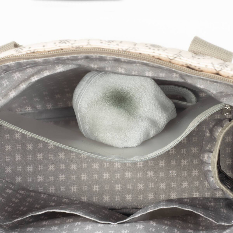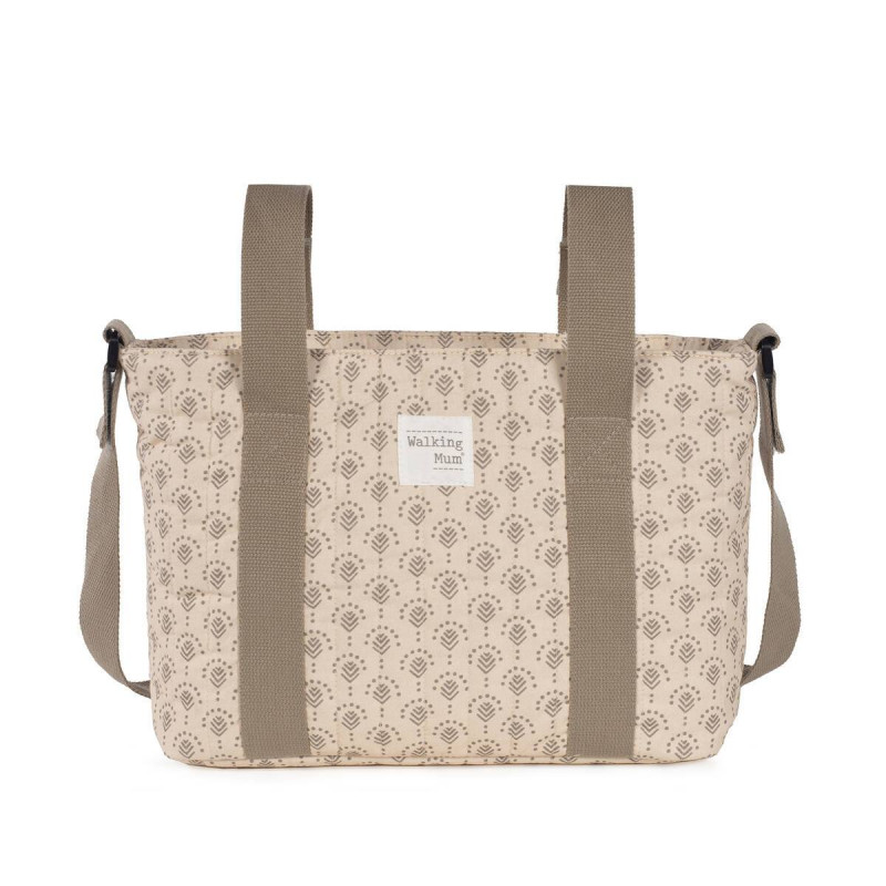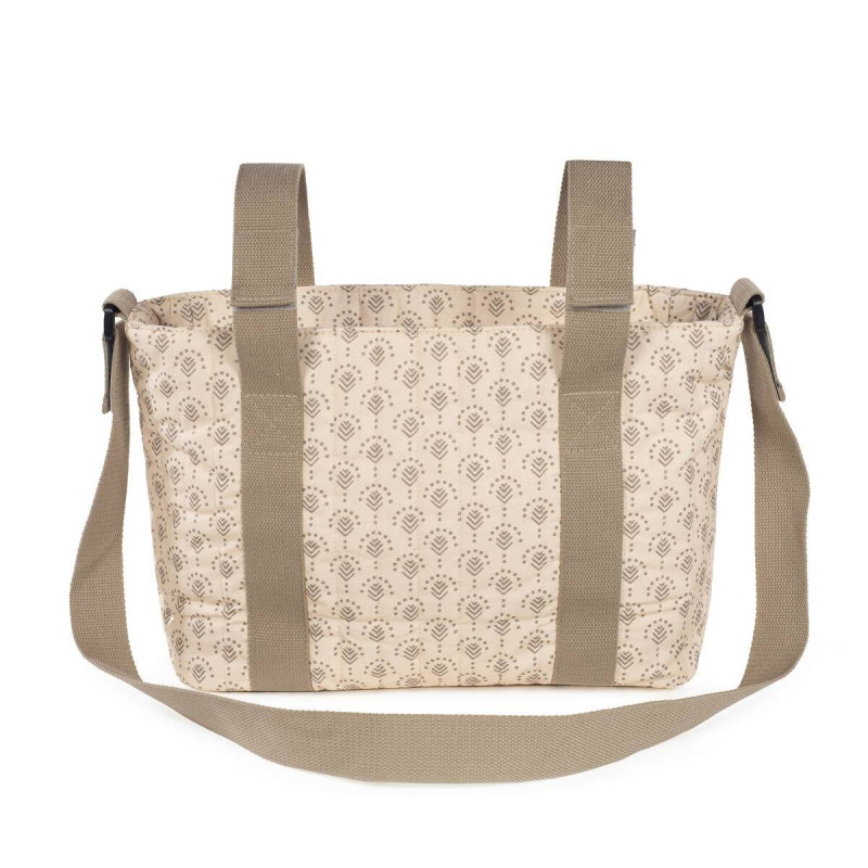 Incorpora asas cortas con las que puedes fijarla a cualquier modelo de silla de paseo y asa larga para que te la puedas colgar en el hombro.