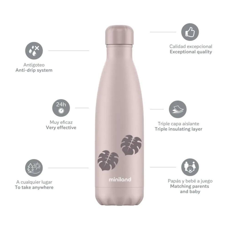 Las botellas térmicas de Miniland son altamente resistentes y eficaces gracias a su doble pared de acero 18/8 (acero 304) y su cámara de vacío, por lo que mantienen tanto el frío como el calor durante todo un día.