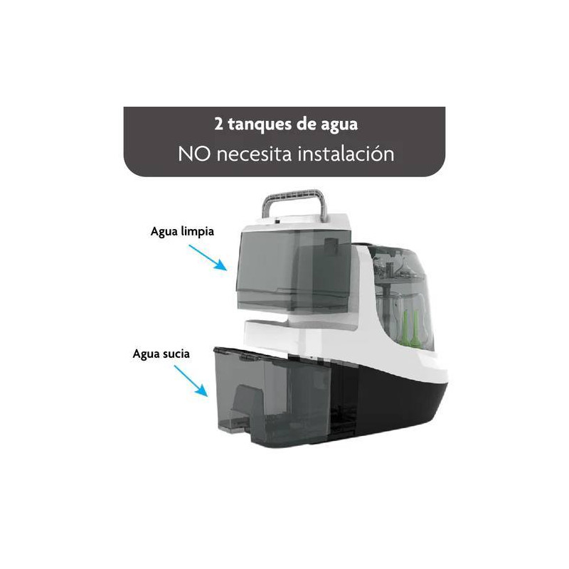 Elimina el 99.9% de los gérmenes con vapor, luego seca con aire caliente filtrado por HEPA