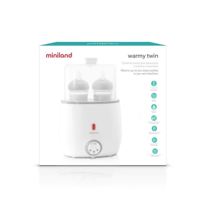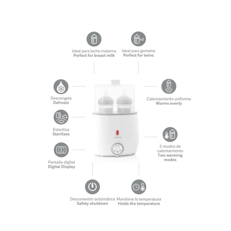 Calienta a la vez hasta 2 biberones o potitos y esteriliza. warmy twin es el calientabiberones ideal para aquellos papás con gemelos o mellizos. Calienta biberones y potitos de forma natural y uniforme utilizando vapor de agua a alta temperatura. También podrás calentar la leche materna perservando todos sus nutrientes y alcanzando una temperatura similar a la corporal de la mamá. warmy twin también incluye la función de esterilización de biberones y accesorios.